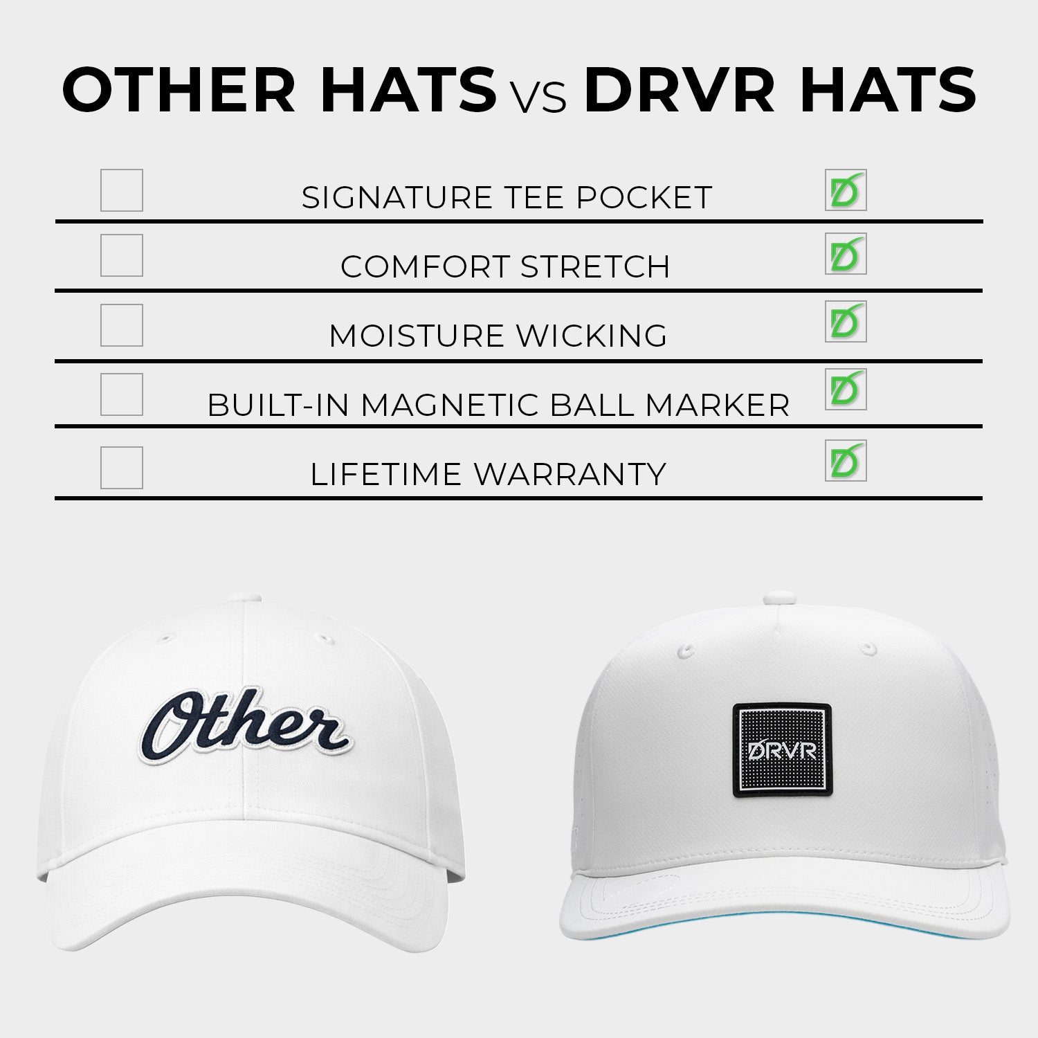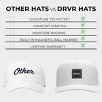 DRVR was built to raise the standard in golf, not follow it. While most brands focus on style or status, we engineered every DRVR hat to deliver true on-course performance. From advanced moisture-wicking materials to four-way stretch comfort, our premium hats are designed to eliminate headwear induced headaches and deliver performance and style that holds its shape through every round.